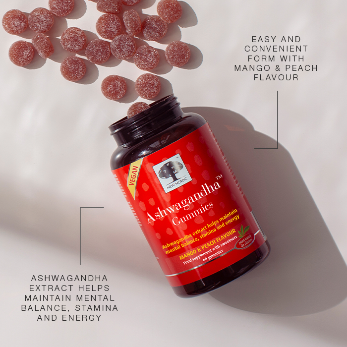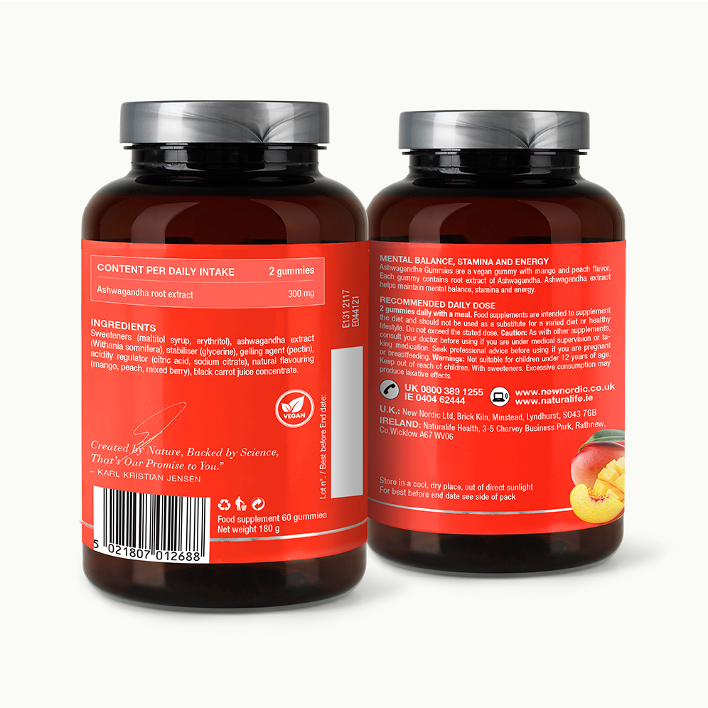 Ashwagandha™ Gummies contain ashwagandha root extract along with natural flavourings and plant-based gelling agents. Ashwagandha helps maintain mental balance, stamina and energy, offering a simple and enjoyable way to support your daily wellbeing.
