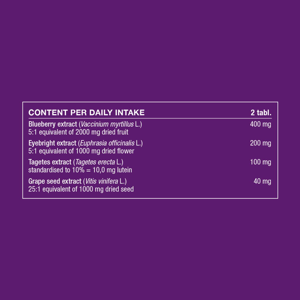 Blue Berry™ Eyebright is a food supplement developed to help maintain normal eye health and vision. The tablets contain Nordic wild blueberries, eyebright and tagetes flower, providing lutein as part of the daily dose.