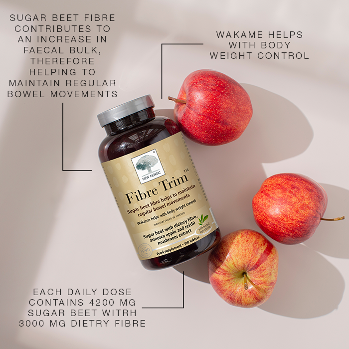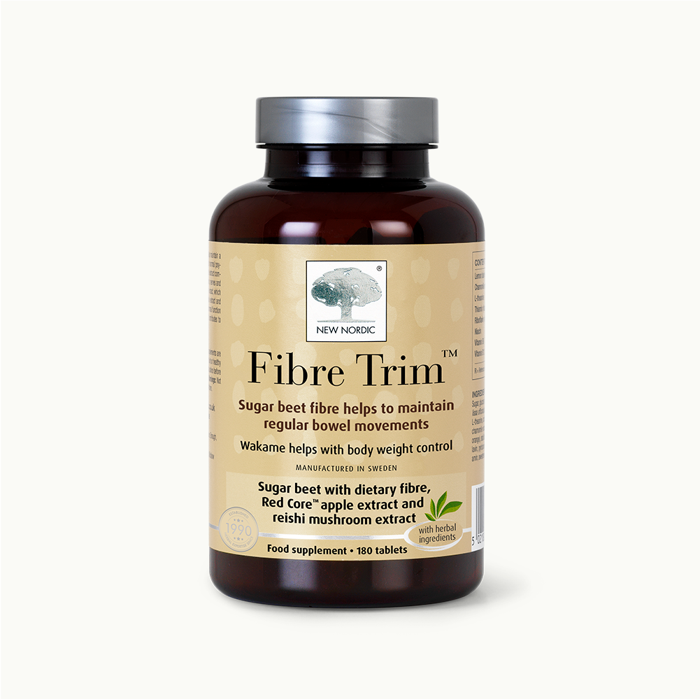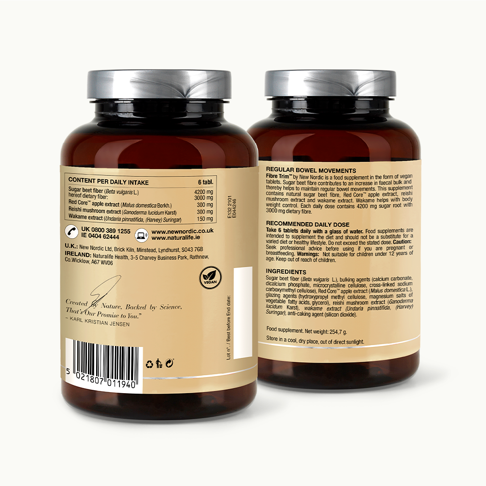 Fibre Trim™ tablets are our everyday fibre supplement, developed to support your daily intake of plant-based fibre. Each tablet provides sugar beet fibre — a natural source of dietary fibre that contributes to an increase in faecal bulk and helps maintain regular bowel movements. Combined with Red Core™ apple, reishi and wakame extracts, this straightforward formula supports your everyday routine with beneficial fibres and botanicals.
