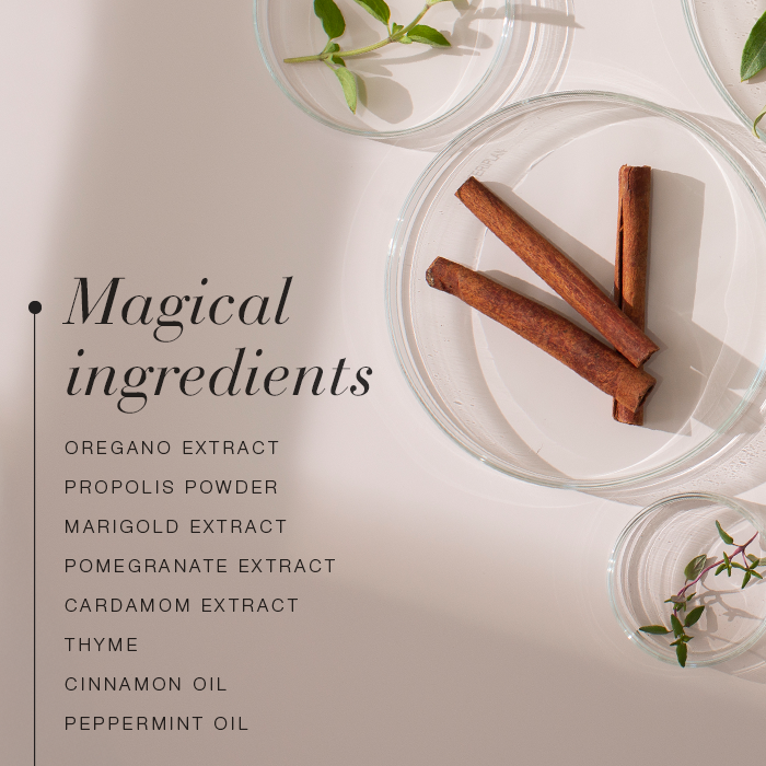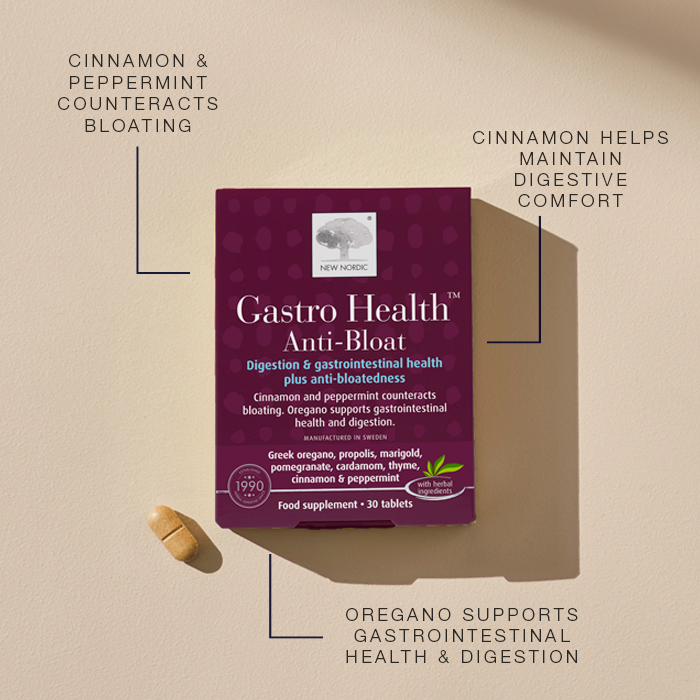 Gastro Health™ Anti-Bloat contains a carefully selected combination of herbal extracts and plant oils that help maintain digestive comfort. Each tablet includes Greek oregano, marigold, pomegranate, cardamom and thyme, complemented by peppermint oil and cinnamon oil. The formula also contains propolis powder. Together, these ingredients form a botanical blend designed to help maintain normal digestion.