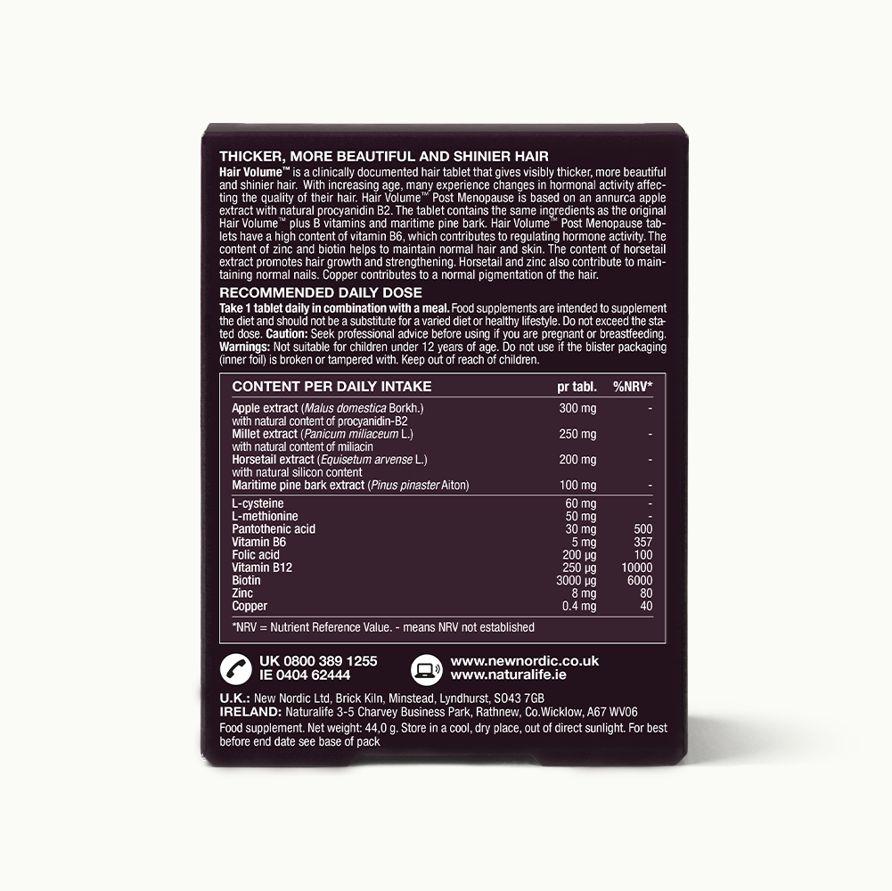 Hair Volume™ Post Menopause is suitable for adults who want to support the appearance and quality of their hair, particularly women experiencing natural changes after menopause. It is ideal for those seeking a tablet that contributes to normal hair, skin and nails, as well as normal hormone activity.