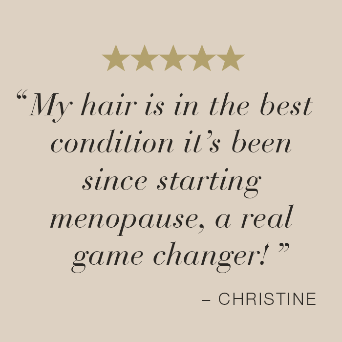 “My hair is in the best condition it’s been in roughly five years, since starting menopause. It feels stronger, healthier, and bouncier, with new growth and less hair fall. It’s been a real game changer!”