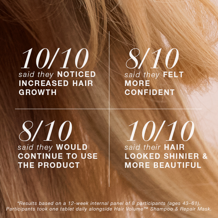 Feeling like your hair isn’t what it used to be? You’re not alone. Hair Volume™ Post Menopause was tested with women aged 43 to 61 over 12 weeks, and the results are real. By taking one tablet daily with Hair Volume™ Shampoo and Repair Mask, they experienced thicker, stronger, shinier hair that addressed menopausal hair loss. The panel shared that their hair felt healthier and more resilient, and that this gave them a confidence boost at this stage of life.