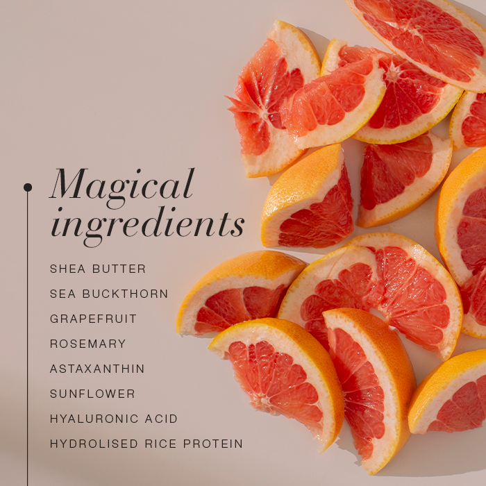 The formula includes shea butter to nourish the skin, hydrolysed rice protein to promote a firmer and more supple appearance, and hyaluronic acid to provide long-lasting moisture and improve skin texture. Plant extracts such as sea buckthorn, grapefruit and astaxanthin offer antioxidant support, helping protect the skin and enhance its natural radiance.