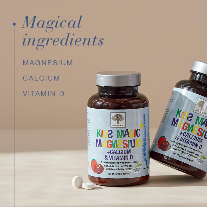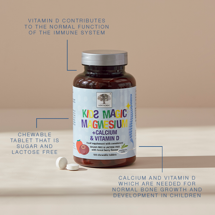 Kids Magic Magnesiumâ„¢ contains magnesium, calcium and vitamin D. Magnesium contributes to normal muscle and nerve function, calcium and vitamin D are needed for normal bone growth and development in children, and vitamin D also contributes to the normal function of the immune system. The chewable tablets are forest-berry flavoured and free from sugar and lactose, making them easy and enjoyable for children to take.