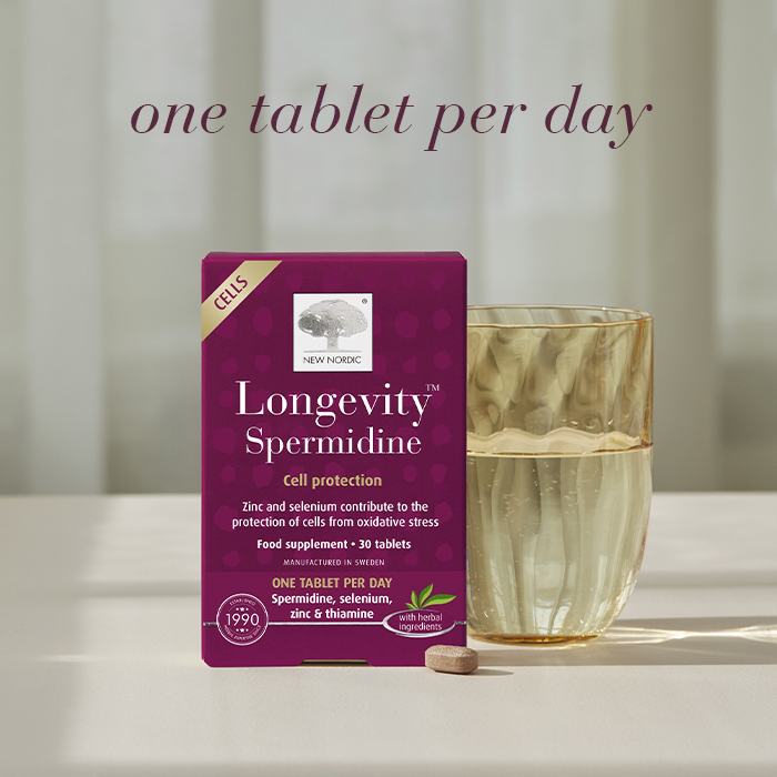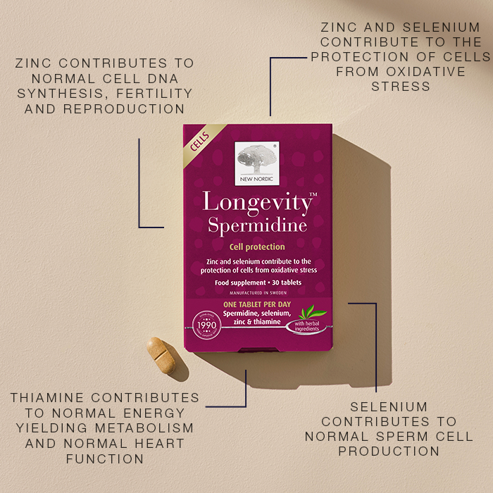 Longevity™ Spermidine by New Nordic is a premium vegan food supplement designed to support long-term wellness, healthy ageing, and optimal cellular function. Each tablet contains naturally sourced spermidine from wheat germ extract, combined with essential nutrients including Thiamine, Zinc, and Selenium. This advanced formula is crafted to promote normal energy-yielding metabolism, maintain healthy cell integrity, and support immune health. Ideal for adults looking to optimise their cellular vitality, Longevity™ Spermidine provides daily nourishment for long-lasting wellbeing and overall longevity.